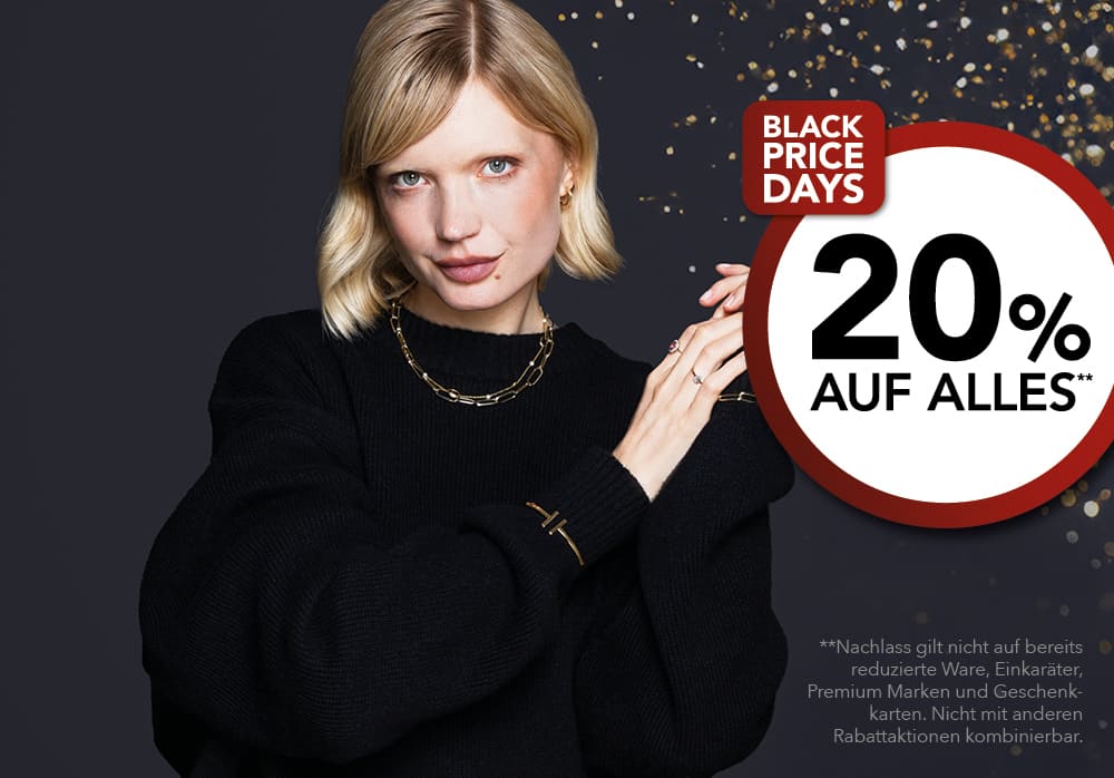 erhältst du vom 28. November bis 2. Dezember 20% Rabatt ** auf unsere gesamte Schmuck- und Uhrenkollektion - sowohl in unseren Filialen als auch im Online-Shop.